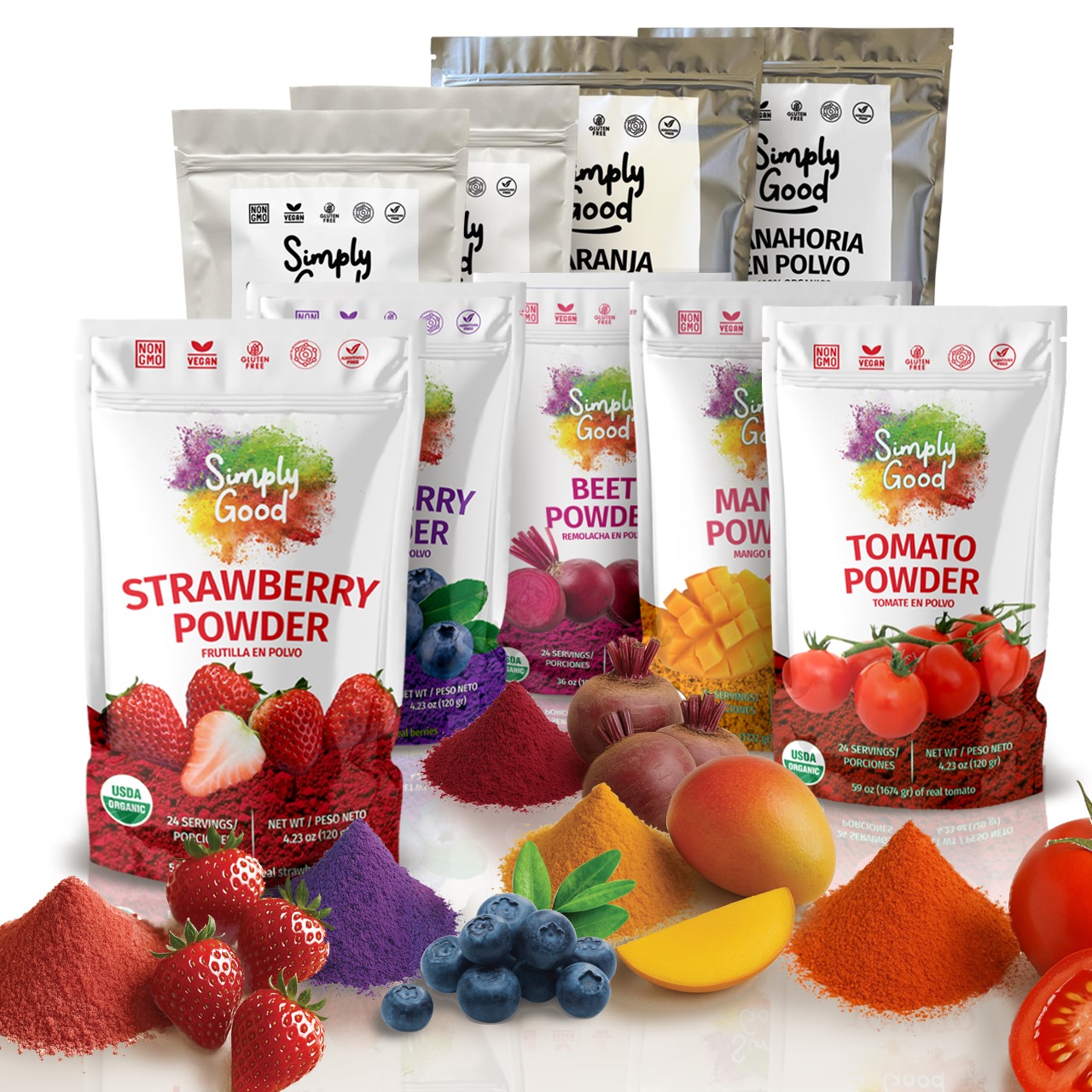 Simply Good son frutas y verduras 100% orgánicas y naturales, transformadas en polvo orgánico, mediante un proceso de deshidratación que conserva sus nutrientes, sabor y color. Sin conservantes, sin aditivos y sin azúcares añadidos, Simply Good te permite consumir más frutas y verduras de forma práctica, rica y simple en tu día a día.